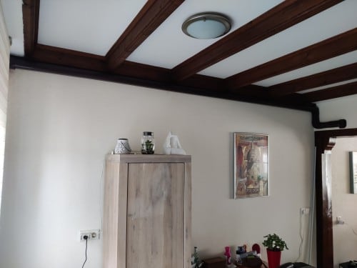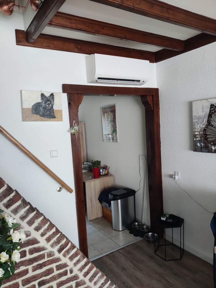 Voor deze Comfora Airco moesten de leidingen van de unit in de woonkamer naar de buitenunit aan de achterkant van het huis. Hiervoor hebben we de leidingen in een bruine goot gelegd die goed past bij de kleur van de houten balken.